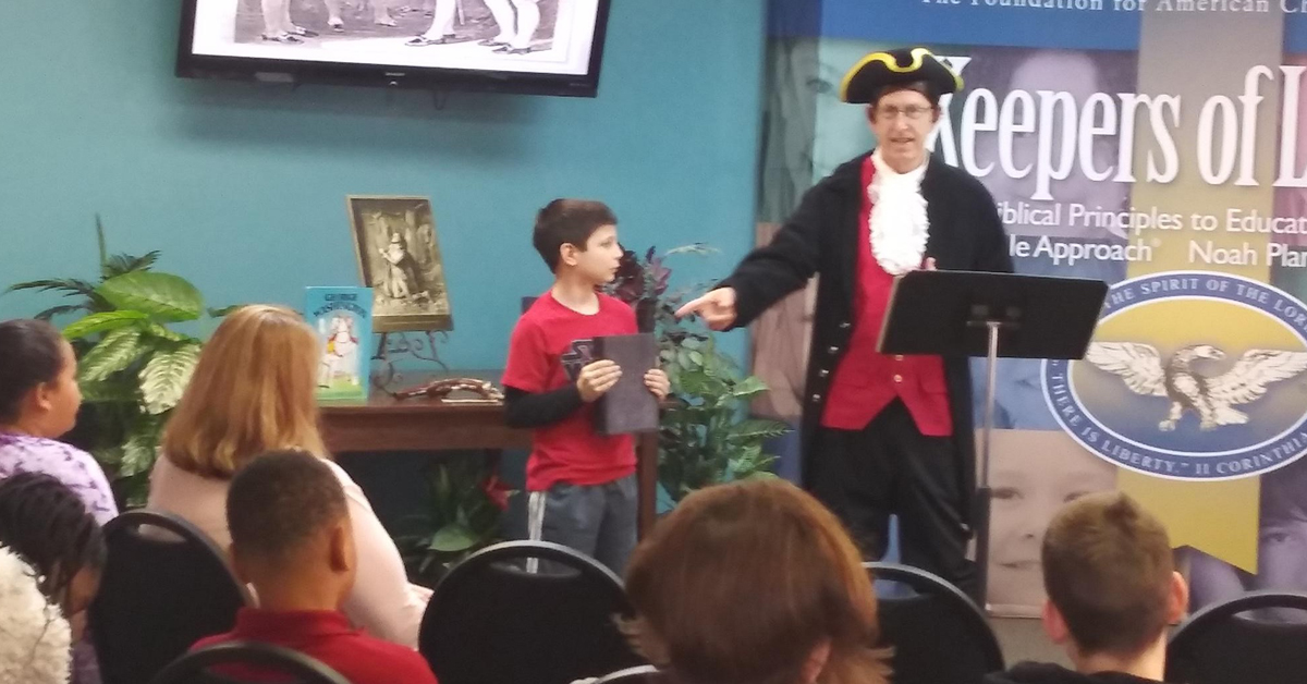 The program George Washington, a Man of Christian Character was presented live in the FACE classroom on Friday, February 17th. Students, teachers and parents from StoneBridge School, Homeschool Plus, and Sweethaven Christian Academy were in the audience. Local homeschoolers and parents also attended. Online there were students from True Foundation school as well as homeschoolers and adults.